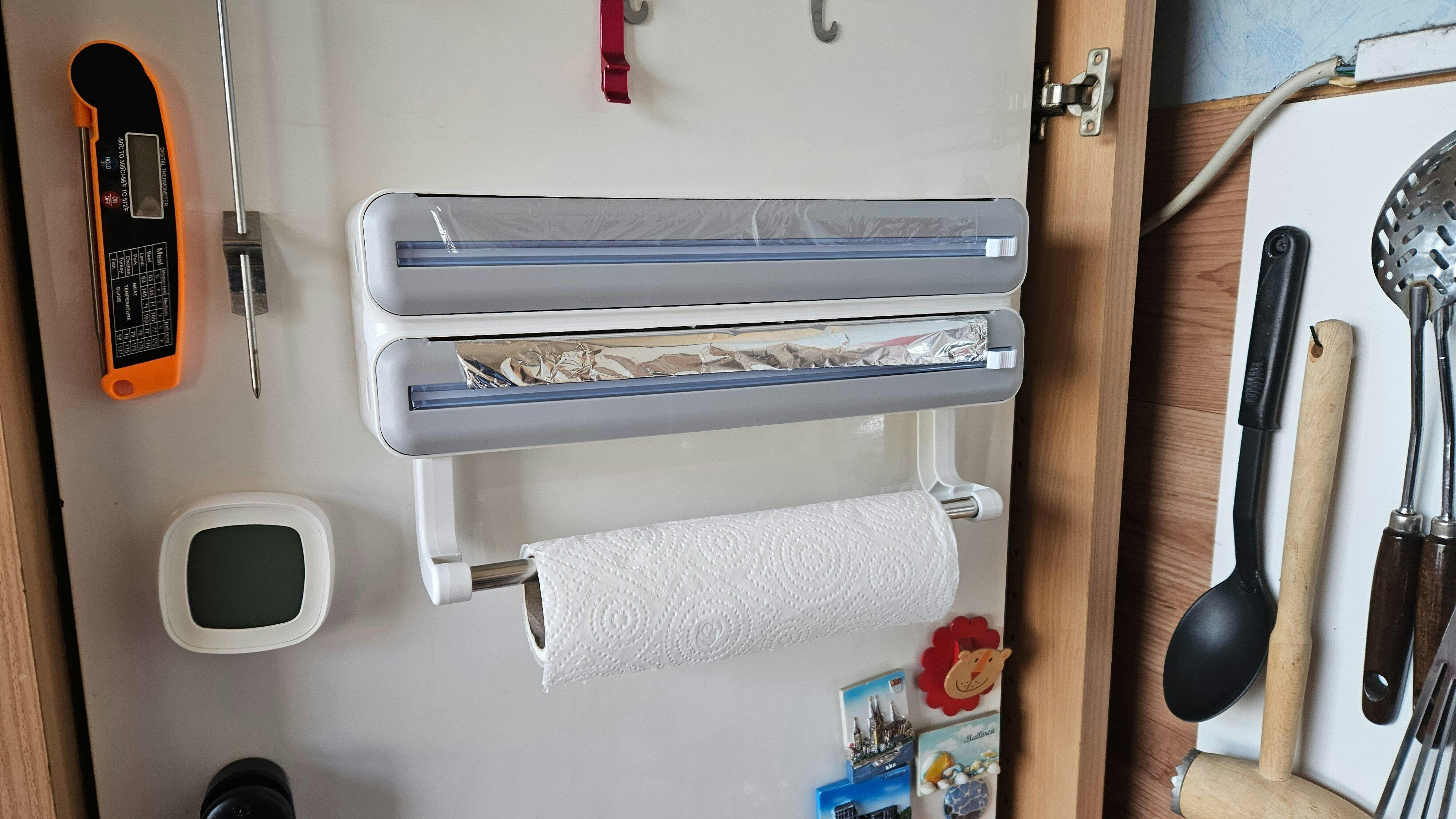 1. Dispensador 4 en 1: Organiza papel aluminio, film adhesivo, toallas y especias en un solo lugar.